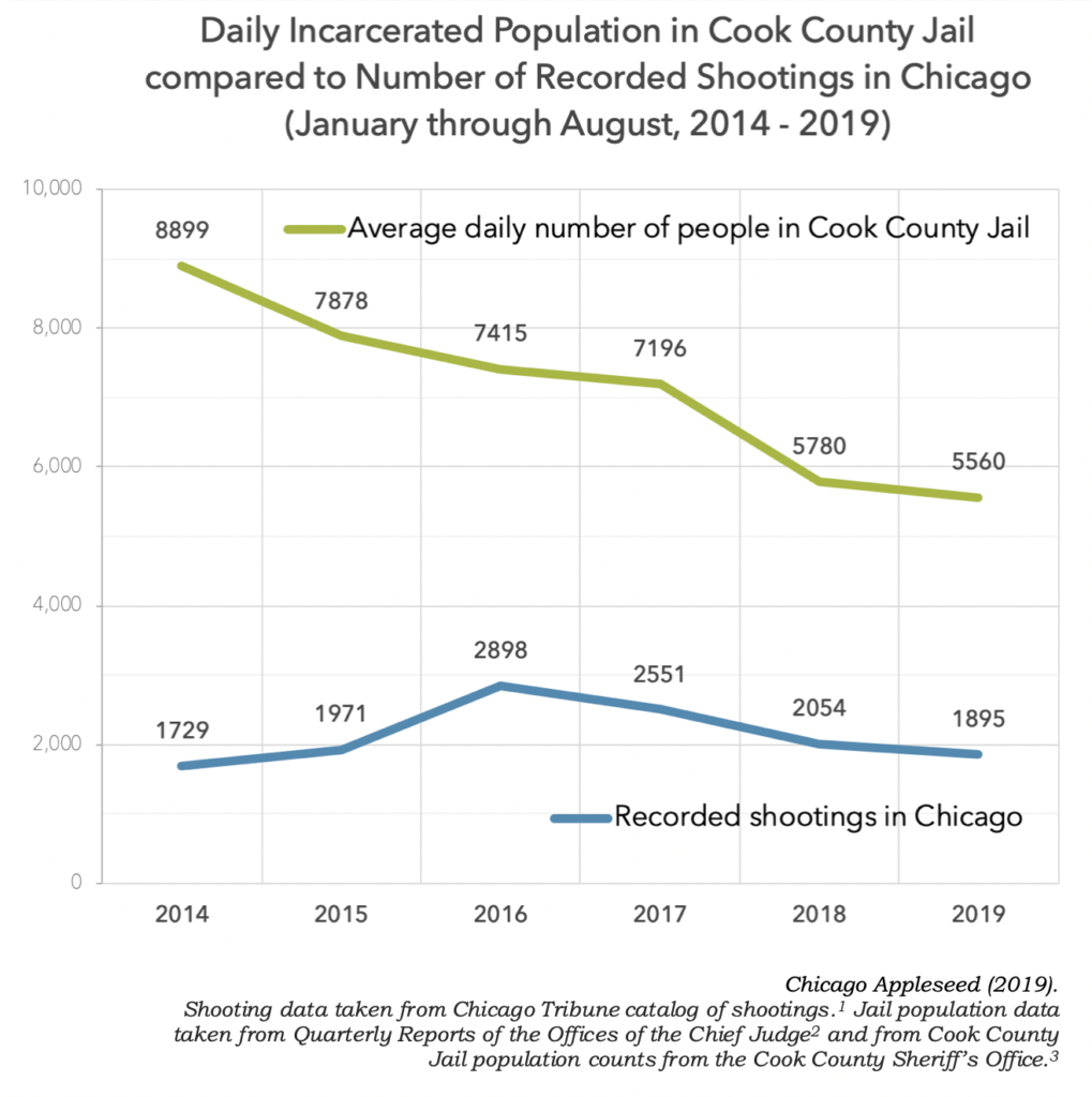 Any notion that bond reform or the policies of the Cook County State’s Attorney have caused a “crime wave” in Chicago is simply untrue. Interpersonal, community, and systemic violence violence are impediments to human wellbeing in this city, and it is vital that politicians and policy makers continue to prioritize the anti-violence work that has clearly warranted positive results. The intersection of bond reform, justice-focused prosecution, and a movement toward decarceration has led to a sharp drop in crime. In the summer of 2019, the average number of people locked up in Cook County Jail on any given day was 25% lower than it was in 2016; even still, the number of recorded shootings in Chicago from January to August of 2019 was down 35% compared to what it was during the same time period in 2016. Sensationalizing the civil unrest in Chicago may serve political narratives – acting as a vehicle to propose tougher, more punitive (and continually disproven) “tough on crime,” “law and order” policies – but it absolutely does not serve Chicago’s communities.