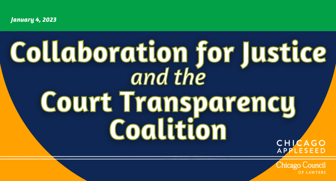 Chicago Appleseed Center for Fair Courts and the Chicago Council of Lawyers—the Collaboration for Justice—are pleased to be part of the Court Transparency Coalition, led by the Better Government Association. As advocates for fair and open courts, Chicago Appleseed and the Council of Lawyers h...
