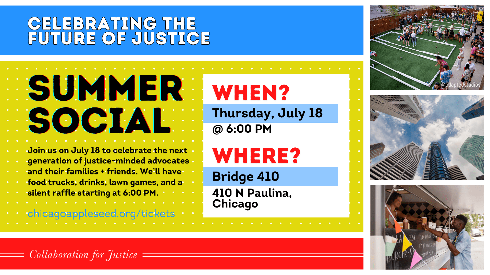 On Thursday, July 18, 2024, Chicago Appleseed Center for Fair Courts and the Chicago Council of Lawyers will host a summer social celebrating our Future Justice Lawyers of Chicago and the people who make the program possible! Join us and the next generation of justice-minded advocates, their lawyer advisors, family, and friends at Bridge 410 (410 N Paulina Street).