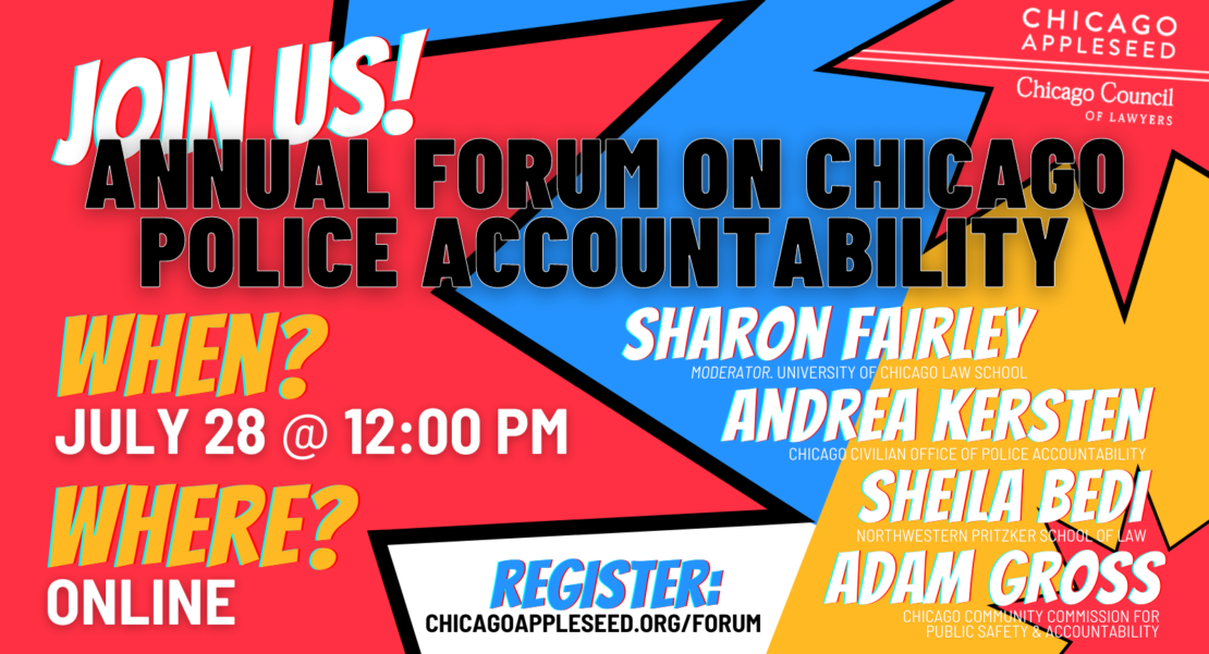 ANNUAL FORUM ON CHICAGO POLICE ACCOUNTABILITY When? Thursday, July 28 @ 12:00 PM (CT) Where? Online - Registrants will be sent link in advance to livestream the event. CLE Credit? For Illinois lawyers, 1.25 hours of CLE credit will be available at the end of the program. Registration? ...